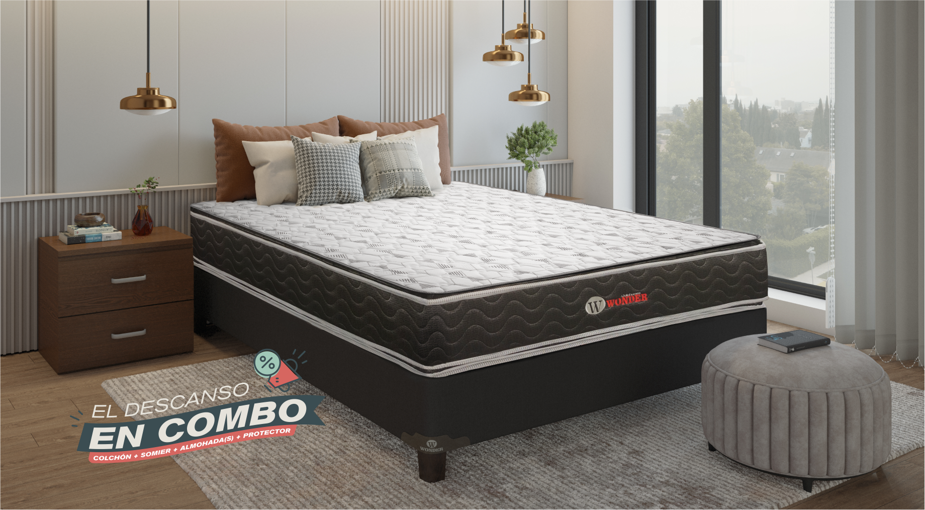 Con nuestros combos Wonder te damos mucho más. Lleva Colchón + Somier (patas de madera) + Almohadas + Protector de colchón