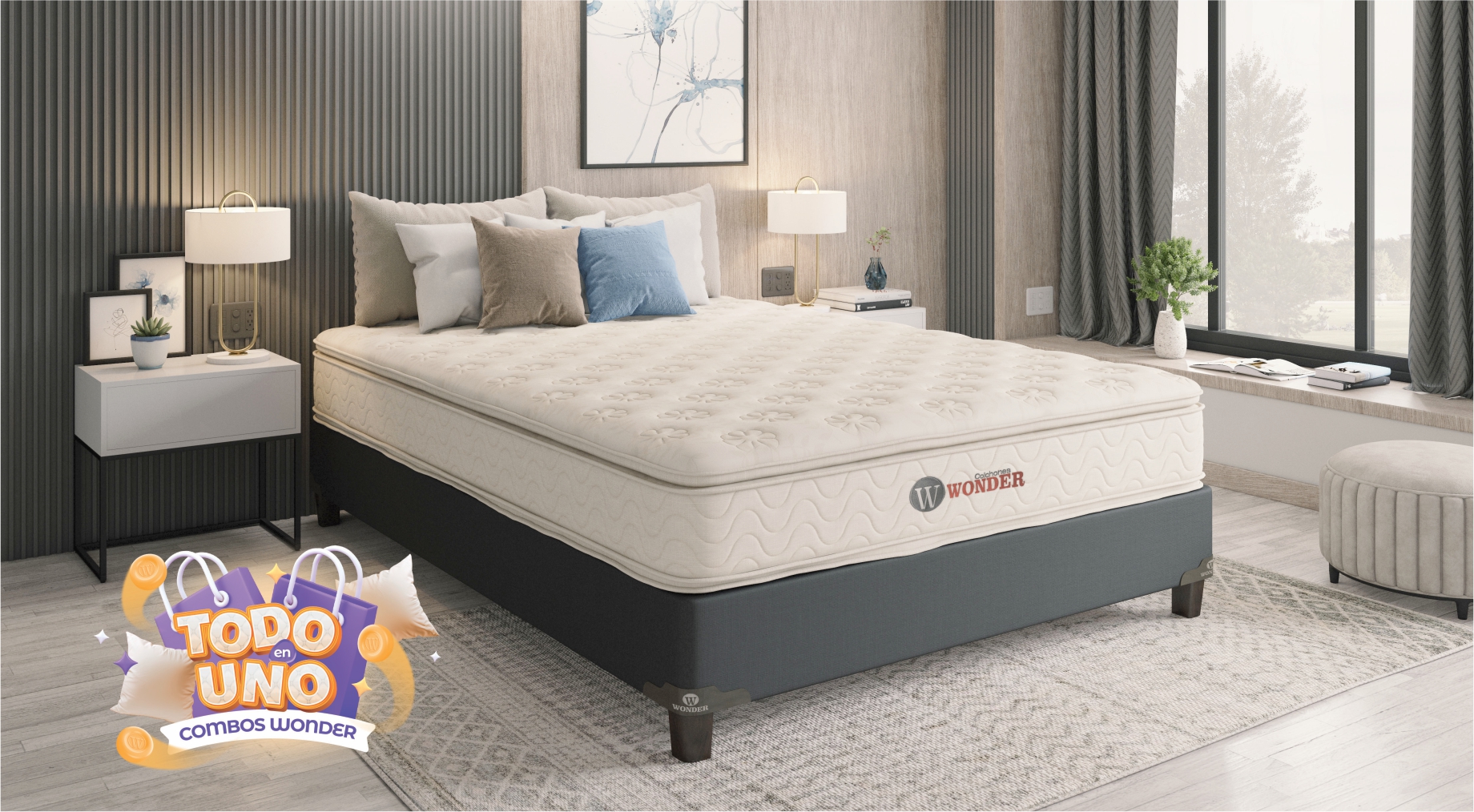 Con nuestros combos Wonder te damos mucho más. Lleva Colchón + Somier (patas de madera) + Almohadas + Protector