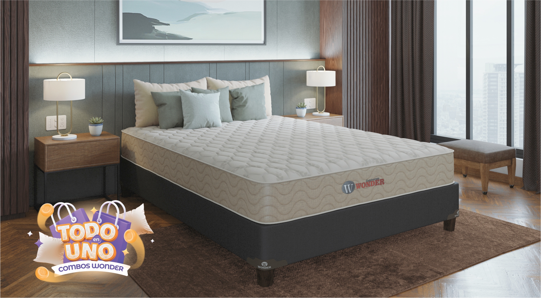 Con nuestros combos Wonder te damos mucho más. Lleva Colchón + Somier (patas de madera) + Almohadas + Protector de colchón