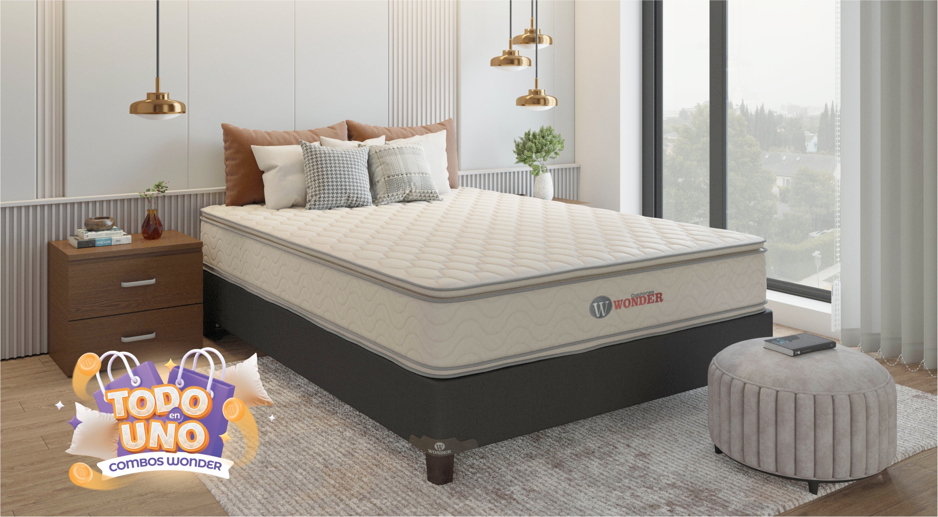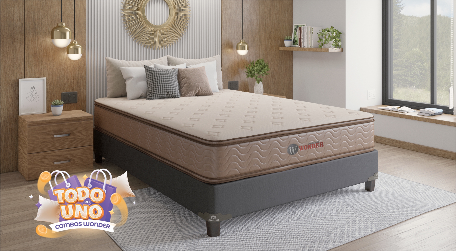 Con nuestros combos Wonder te damos mucho más. Lleva Colchón + Somier (patas de madera) + Almohadas + Protector de colchón