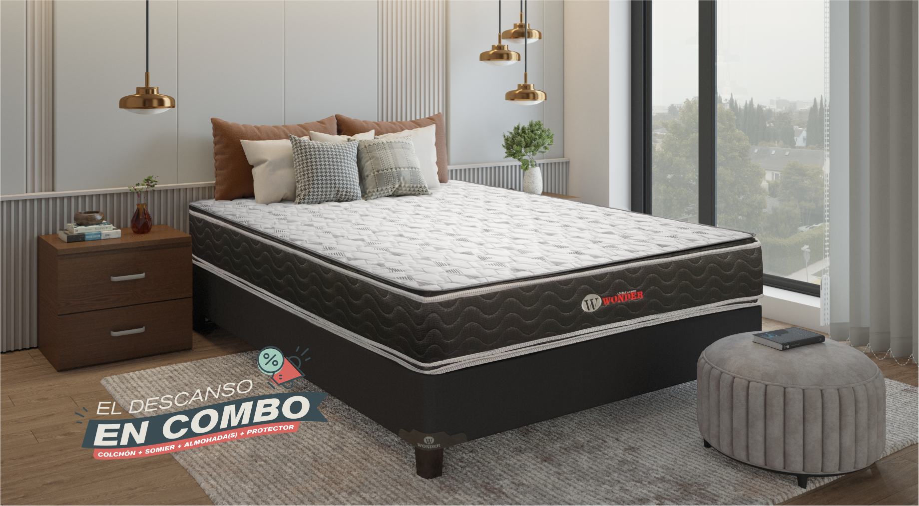 Con nuestros combos Wonder te damos mucho más. Lleva Colchón + Somier (patas de madera) + Almohadas + Protector de colchón